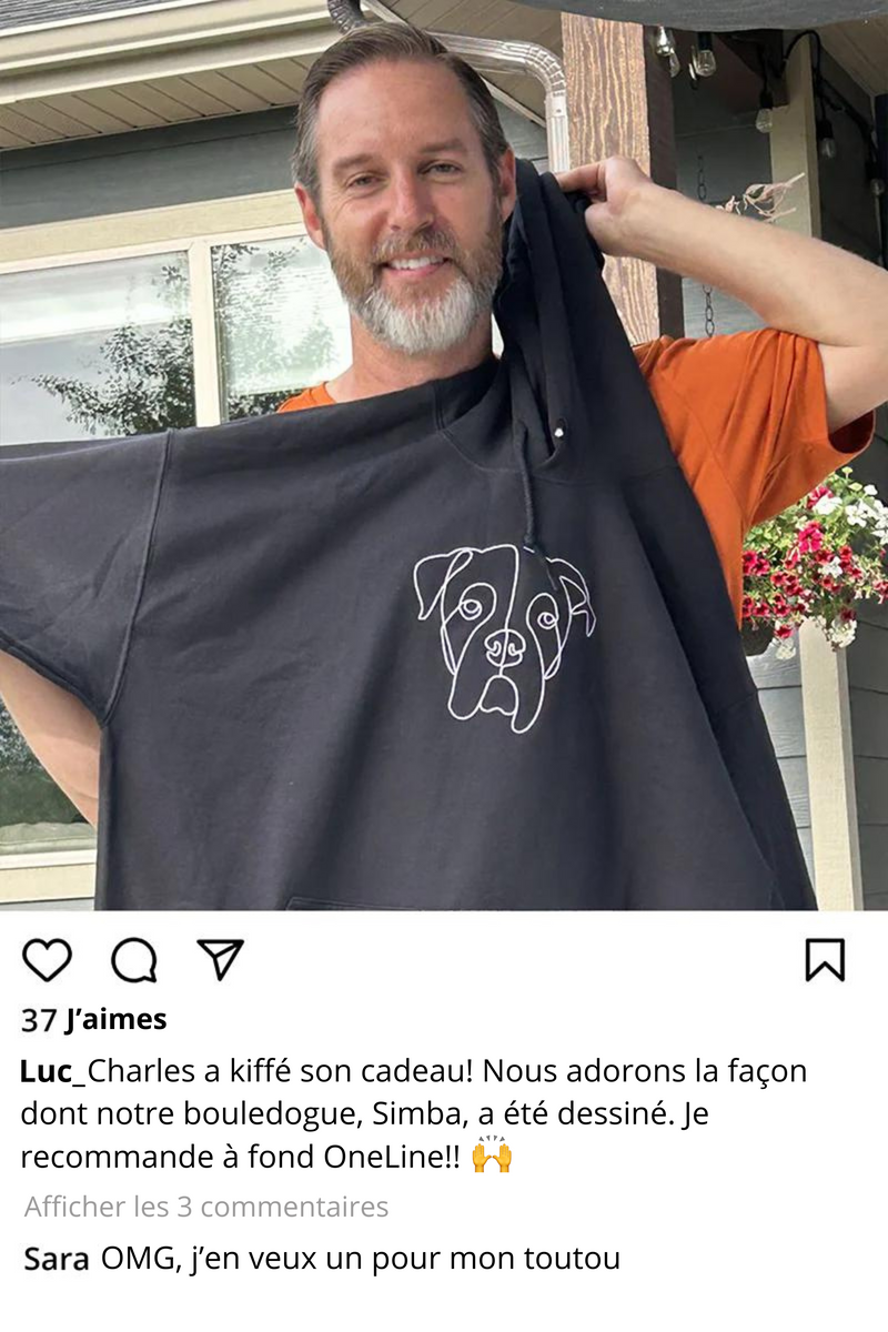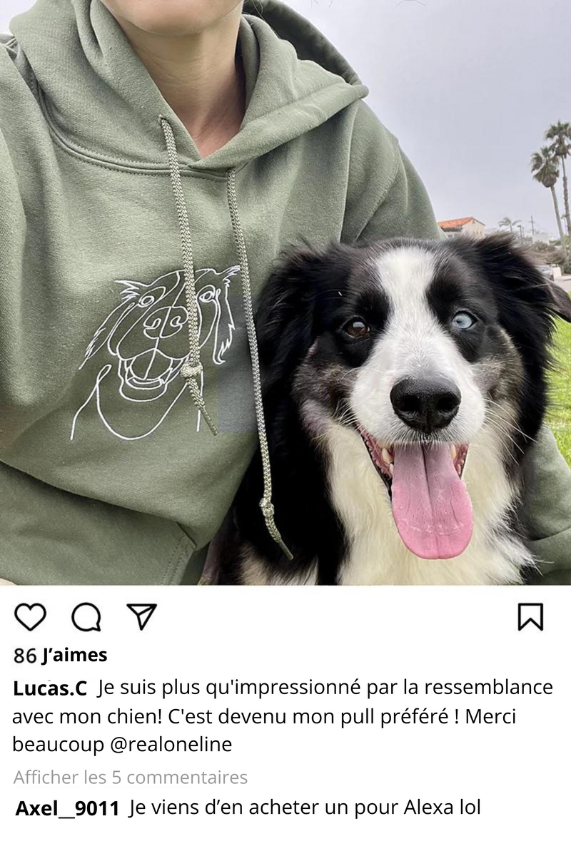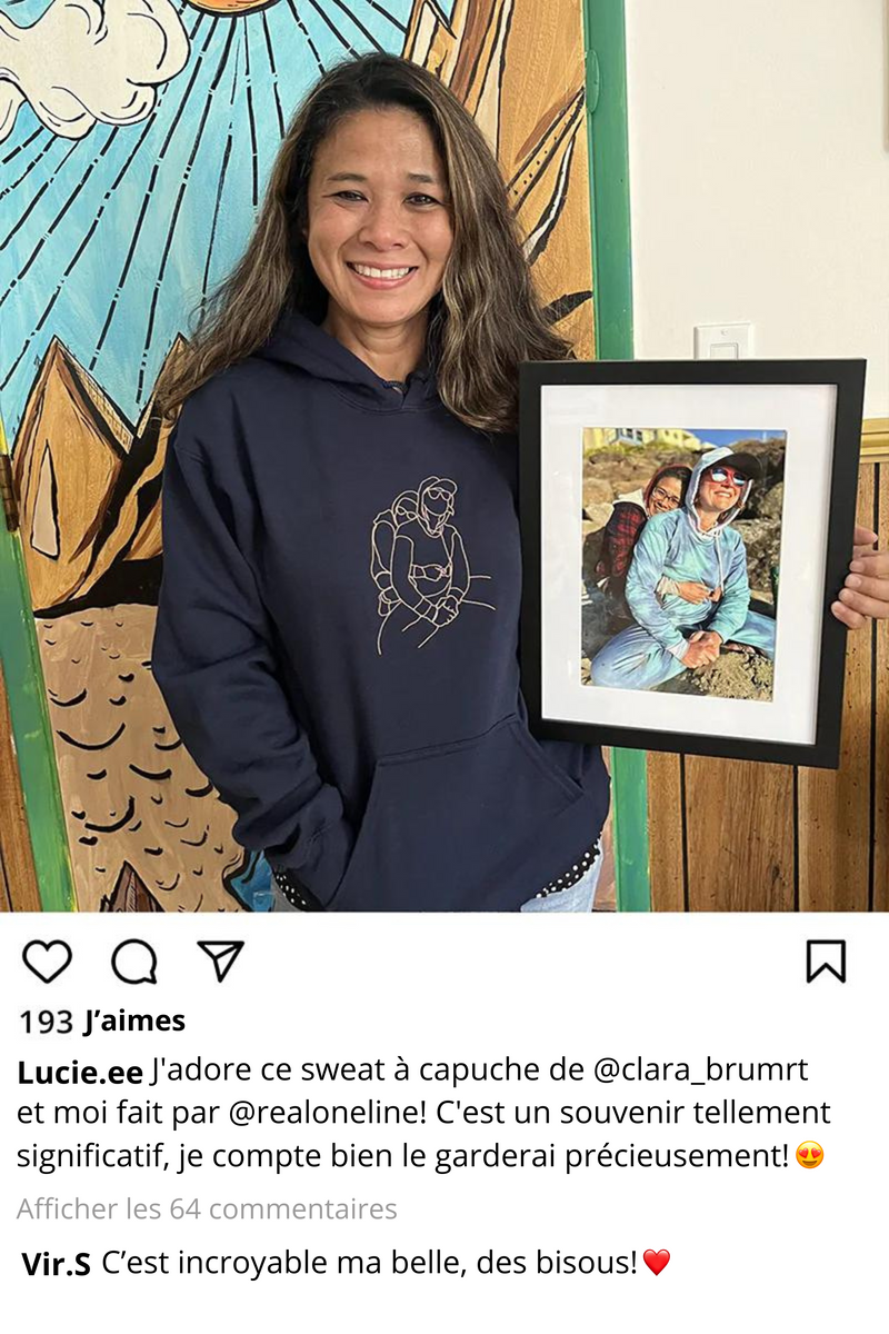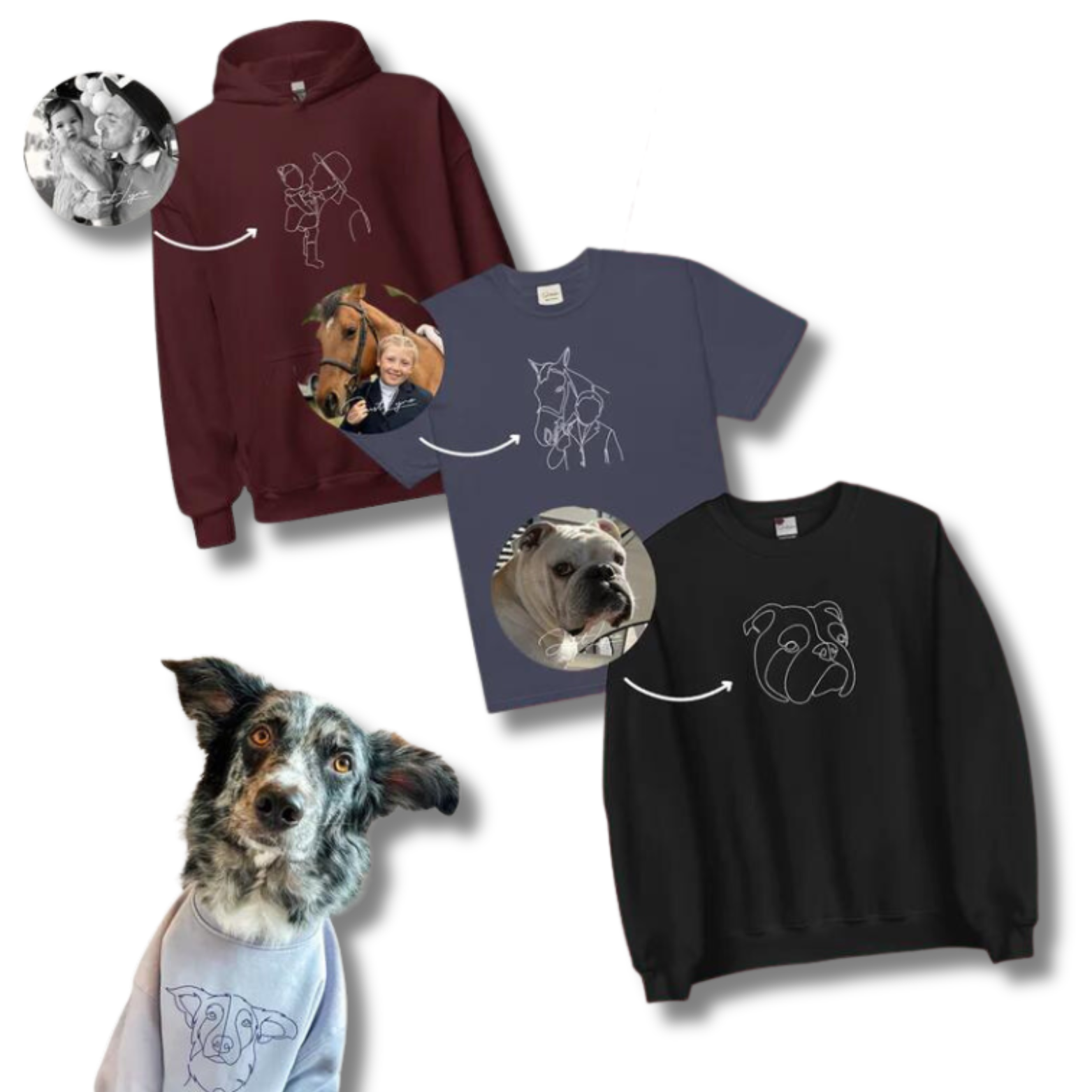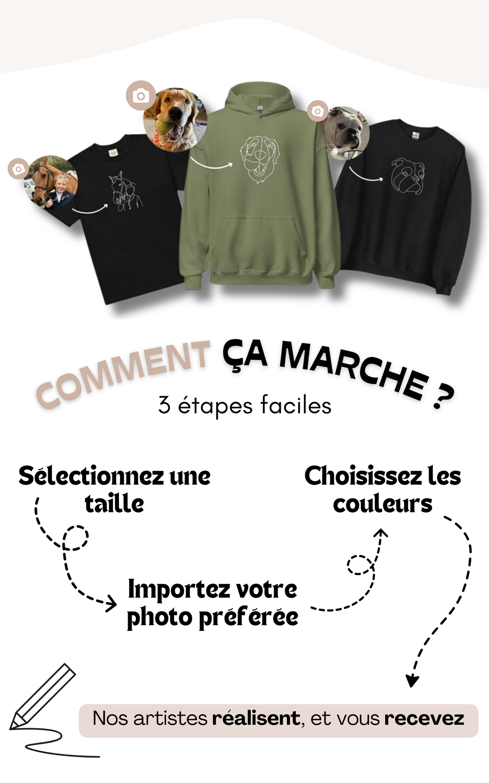 Une fois redessinée dans un style minimaliste par nos artistes, votre photo est soigneusement brodée sur nos t-shirts, sweatshirts et bien plus encore.